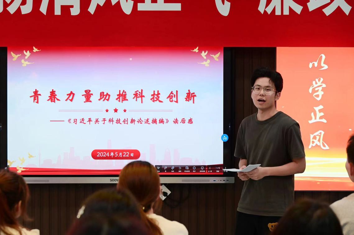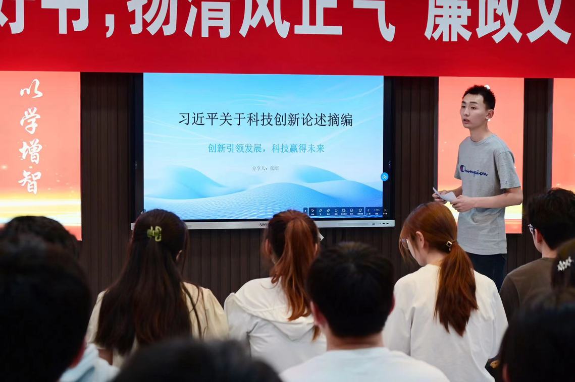 于蕴蕴以党的二十大报告的指导思想为切入点,并结合中国近几年的发展数据,分享了《习近平关于科技创新论述摘编》的学习心得。习近平总书记强调了高质量发展是全面建设社会主义现代化国家的首要任务。高质量发展首先是以人民为中心的发展;是增强宏观经济稳定性的发展;是企业标准化赋能的发展;是实施创新驱动战略的发展;是生态优先、绿色发展为导向的发展。她希望同学们未来走出校园,走上工作岗位,投身到现代化结社中去,为祖国的高质量发展贡献自己的青春力量。新时代的青年生逢盛世,当把握时代机遇,争做高素质人才支撑高质量发展。
