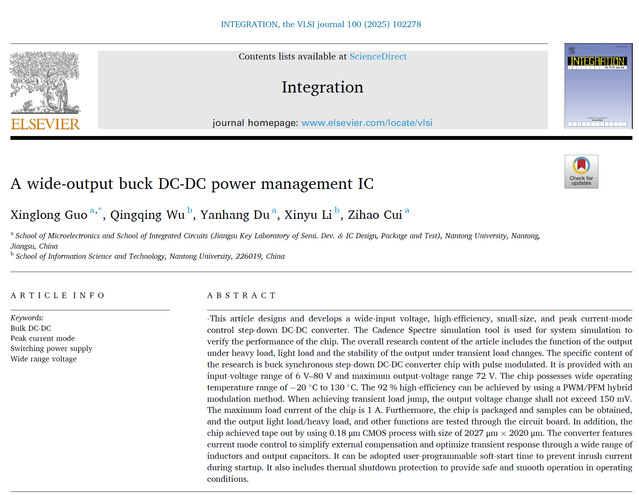 随着信息技术的发展,计算机设备、移动电话、智能手环、轻便无线通讯等便携式设备的尺寸越来越小,集成的功能越来越多,要求设备电源系统具有较小的尺寸和成本,能够高效率的提供更多能量,对电源管理芯片的需求日益增加,因此迫切需求有关的电源管理芯片。据此需要,3D动漫 郭兴龙教授设计研究了一款高效率、小尺寸的峰值电流模控制的降压型DC-DC变换器。此研究论文《A Wide-Output Buck DC-DC Power Management IC》于2024年9月6日在线发表于期刊《Integration》上,论文第一作者为郭兴龙教授,第一单位为3D动漫 。