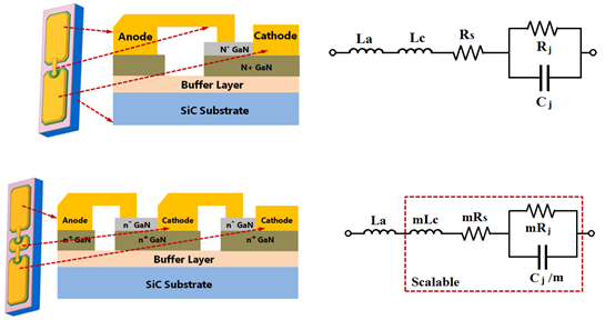 研究提出了一种GaN肖特基二极管可缩放大信号等效电路模型,以肖特基二极管的阴极数目作为归一化因子,并分别给出了寄生模型参数、本征模型参数和直流模型参数的可缩放规则。实验结果表明,在0.1-40GHz频率范围内,模拟和测试结果吻合很好,验证了可缩放模型的正确性,为毫米波频段芯片研制提供模型支撑。