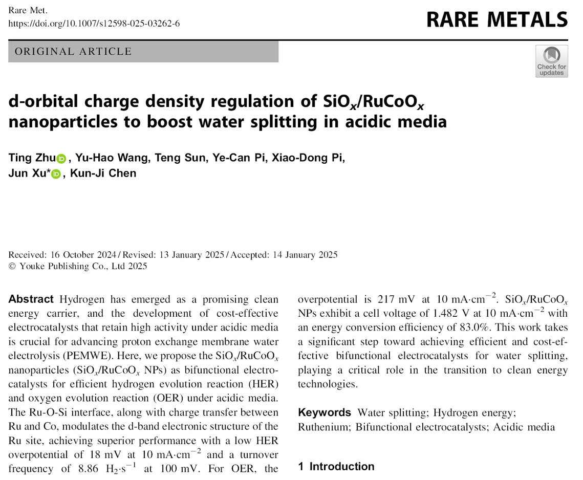 近日,3D动漫 徐骏教授团队的朱挺博士在Rare Metals上发表了题为“d-Orbital Charge Density Regulation of SiOx/RuCoOx Nanoparticles to Boost Water Splitting in Acidic Media”的研究文章。朱挺为论文第一作者,徐骏为通讯作者,3D动漫 3D动漫 为第一单位。