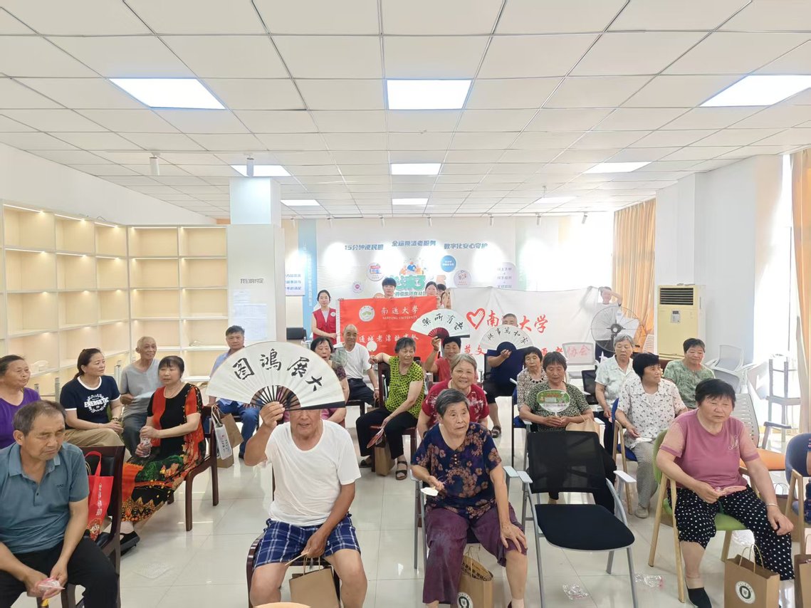 创作间隙,一场温馨的 “故事会” 自然展开。来自连云港的王奶奶,捧着自己刚做好的、带着淡紫色晕染的漆扇,缓缓说起了她在通城的异乡故事。“刚到这儿的时候,听不懂本地话,出门买个菜都犯怵。” 王奶奶笑着说,“后来邻居们瞧见了,就慢慢教我,哪家的菜新鲜,哪家的老板实在,都一五一十告诉我。现在啊,我在这儿住得比老家还熟络,社区活动也总喊我,这不,今天又和你们这些孩子一块儿做扇子,心里暖乎乎的。”同学们也和老人们分享自己的大学生活和日常小趣事。从老人口中的 “阖家团圆” 到年轻人讲的 “宿舍情深”,不同年代的生活片段,在笑声中找到了共鸣。