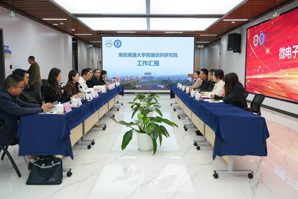 10 月 22 日上午,学院党总支书记金翼、副院长(主持工作)赵继聪带领班子成员及科研骨干等前往海安3D动漫 高端纺织研究院,就研究院建设规划、科研工作推进、产学研协同合作等内容开展学习交流。